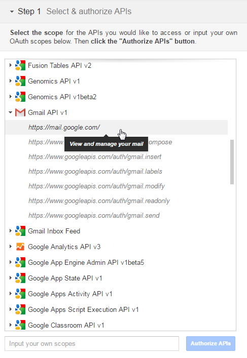 例えばGMailを利用したい場合など、GAEがGoogle APIに利用したいサービスを指定する際にはサービスのURLとスコープ(利用の範囲)が必要である。これらはOAuthのデモンストレーションサイトである「