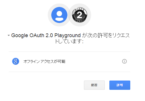 PlayGroundの利用方法の概要を確認する。まずはStep1で利用可能なスコープ名の一覧が表示されている。GAEからGoogle APIを利用する場合、ここに表示されているスコープ名が利用できる。一覧の中から利用したいサービス(スコープ名)を一覧から指定して「Authorize APIs」ボタンを押下すると以下のようなGoogle APIのユーザ認証確認画面にリダイレクトされる。「許可」ボタンを押下する。