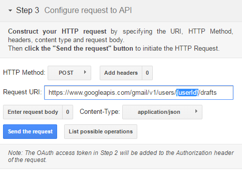 次に、Step2でGoogle APIから受け取った「Authorization code」が表示されるため、「Exchange authorization code for tokens」ボタンを押下。すると「Refresh token」「Access token」が取得される。次にStep3に移り「List possible operations」ボタンを押下すると利用可能なサービスのURIが一覧表示される。GAEからGoogle APIを利用する際にも、このサービスURLを利用する。一覧から利用するサービスURIを選択すると、Request URIの項目に同URLが表示される。最後に「Send the request」ボタンを押下すると、取得した「Access token」を利用してGoogle APIサービスの要求が発生し、結果が画面右側に表示される。