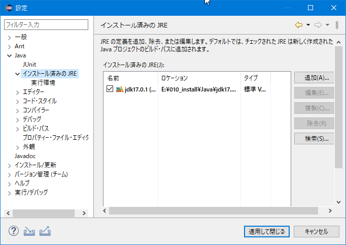 ■ Eclipse設定(インストール済みJDKの関連付け)