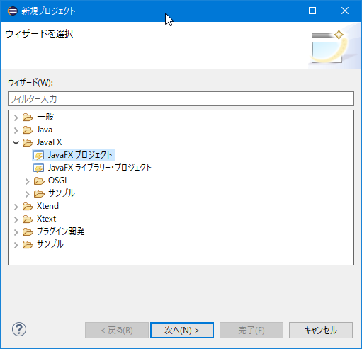 「JavaFX」にチェックを入れて、「完了」を押下。