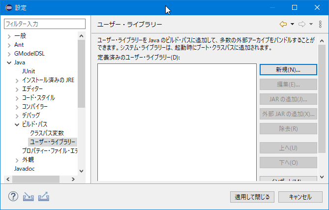 「ウィンドウ - 設定」ダイアログを開き、「Java - ビルド・パス - ユーザー・ライブラリ」を選択する。