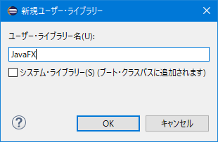 「新規」ボタンを押下して、ユーザー・ライブラリー名に「JavaFX」と入力して、「OK」ボタンを押下する。