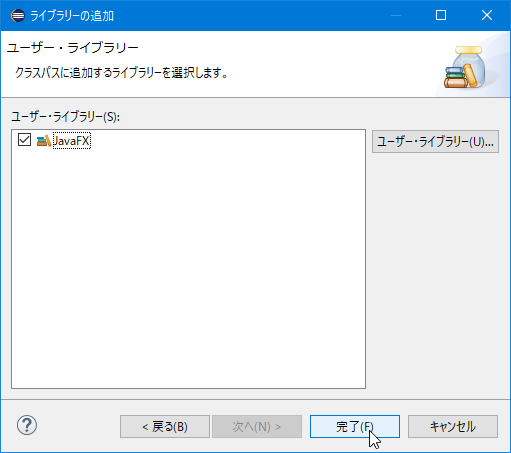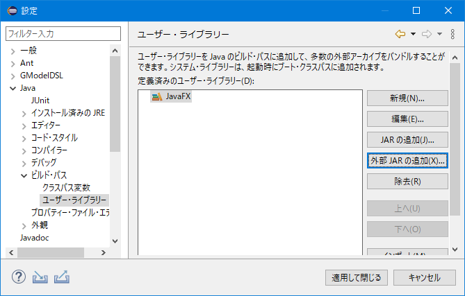 これで、ユーザ定義した外部JARグループ「JavaFX」が作成されました。