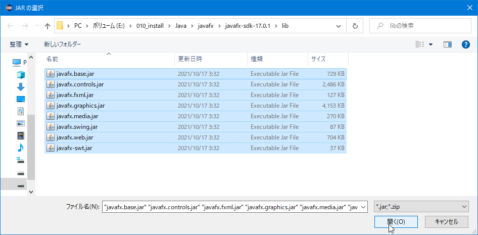 ダウンロード済みのJavaFXの「lib/*.jar」をすべて選択して、「OK」ボタンを押下する。