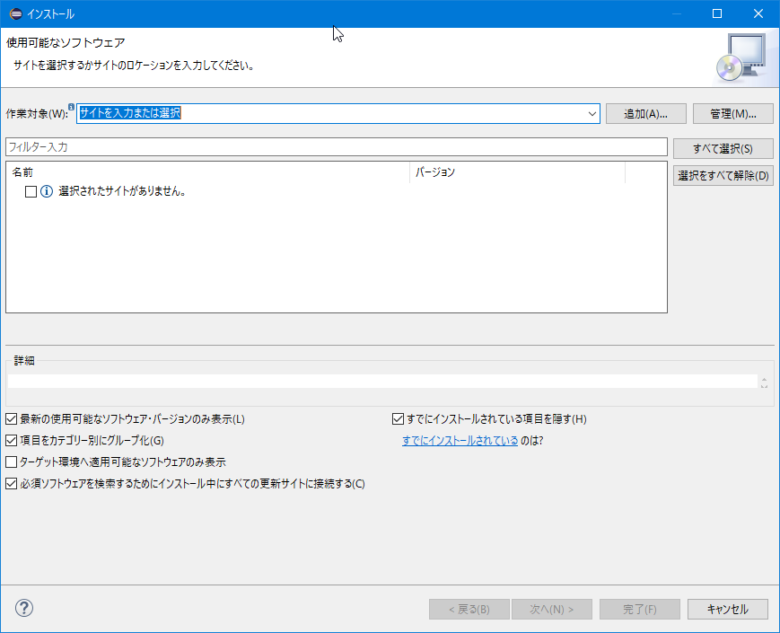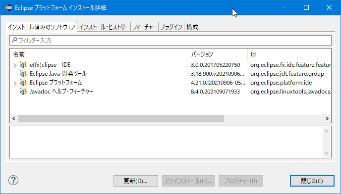 作業対象に「https://download.eclipse.org/releases/2021-09」を入力。 その後、以下のソフトウェアをインストールする。