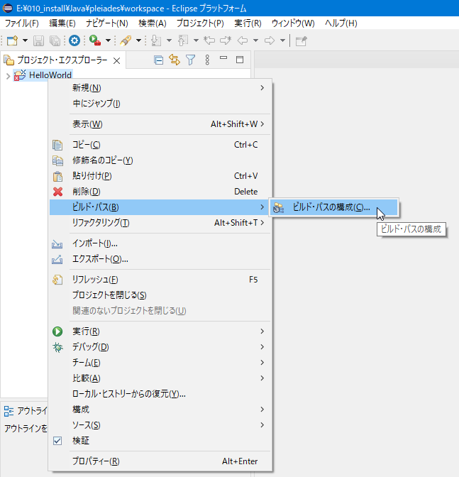 「プロジェクト・エクスプローラー」のプロジェクト名を右クリックして「ビルド・パス - ビルド・パスの構成」を選択する。