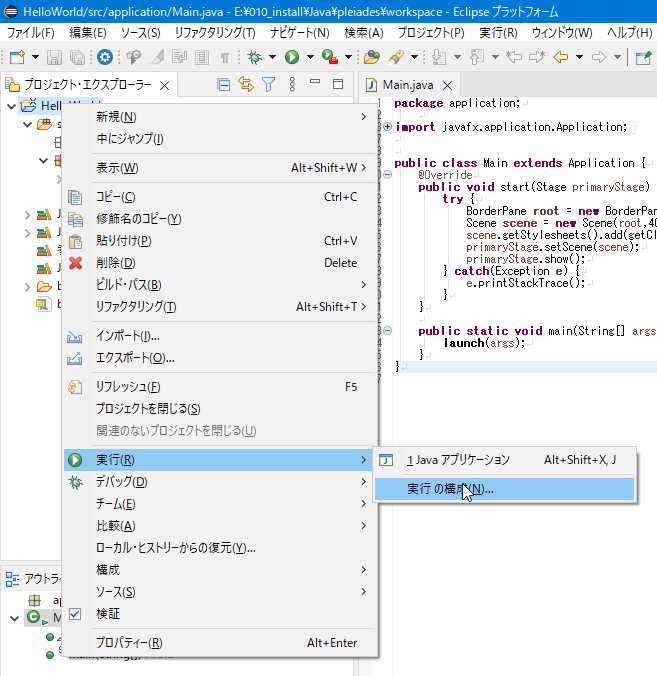 最後に、実行時にJavaFXを利用するための実行構成を定義します。プロジェクト名を右クリックして、「実行 - 実行の構成」を選択。