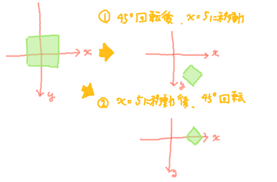 座標変換リスト/Affineクラスのどちらを利用する場合も、座標変換を合成する順番によって座標変換の内容が変わるため注意が必要である。