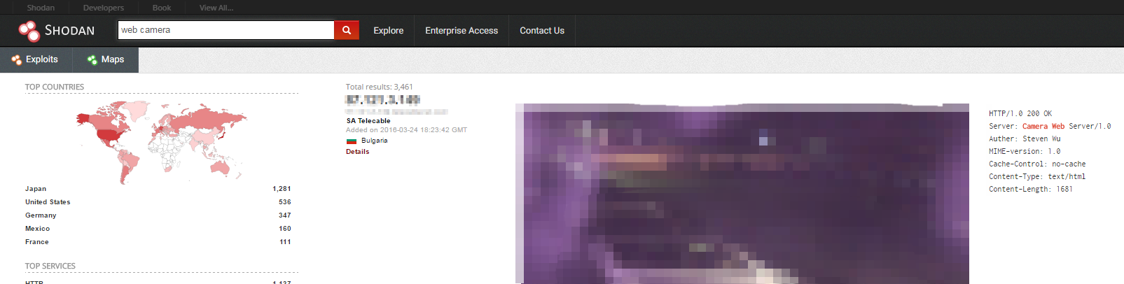 図2:Shodanにて検索ワード「web camera」として検索した結果。アクセス可能な機器のIPアドレス(図中央モザイク部)と、バナー情報(図右部)、さらにwebカメラの場合は記録された画像が出力されている。