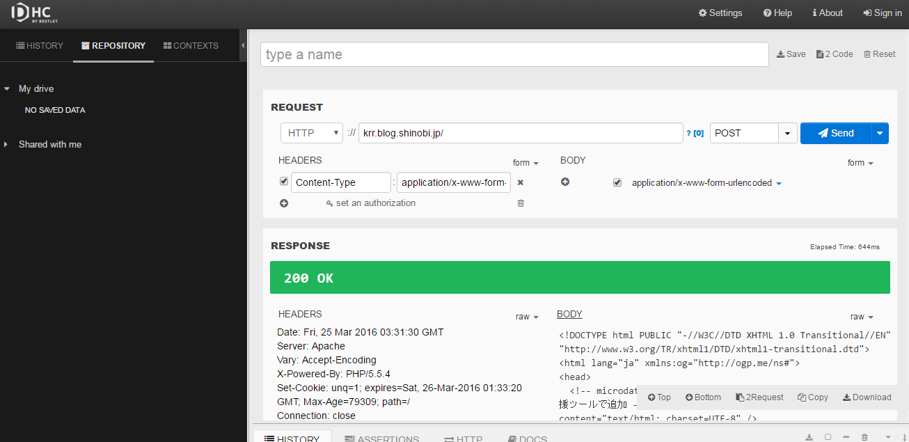 図3:Google Chromeのアドオン『DHC Client(*12)』を利用して、このサイト(2016年3月時点でIPアドレス「112.140.42.77」ポート番号「80」)が返すバナー情報(HTTPレスポンス・ヘッダ情報)を確認した様子。図中央下にHTTPレスポンス・ヘッダーがあり、サーバが「Apache」で「PHP5.5.4」を利用していることが分かる。