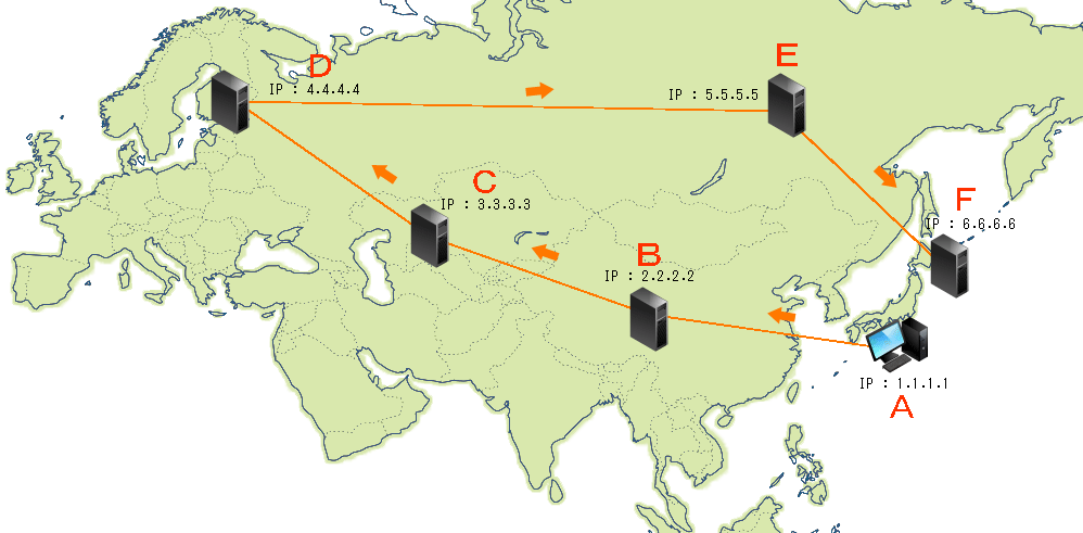 図4:TOR利用イメージ。端末AからサーバFに攻撃する際にB~EのTORプロキシを利用した場合、サーバFの管理者はE~Bのプロキシについて順にログ取得ができないと、攻撃者Aにたどり着けない。