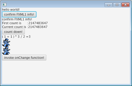 fx:includeタグ(TestFXML2.fxml:20行目)により、TestFXML3.fxmlがfx:id=fxml3として読み込まれている。これにより該当箇所に「hello world!」というTestFXML3.fxmlの内容が画面出力されているのが確認できる。また、読み込み完了と同時にTestFXML3.fxmlのコントローラ(TestFXML3Controller)がインスタンス化され、マッピングが実行され、その後initialize関数(TestFXML3Controller.java:20行目)が呼び出されたため、標準出力に「initialise TestFXML3Controller.」が出力されているのが確認できる
